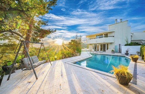 This luxurious private Bel-Air estate features magical views of the ocean, city, and the canyons. The house has a beautiful pool and a Jacuzzi as well as an en suite master bedroom with five bedrooms upstairs and one bedroom downstairs. With 6 bathrooms equipped with luxurious amenities like a jetted bathtub and bidet, relaxation is key here. Experience what Los Angeles has to offer with a stay at our serene and luxurious home 5 minutes away from Sunset Blvd. This is one of the safest neighborhoods in the entire Los Angeles, but for added security, there are outdoor cameras on the entire backyard and front entrance.