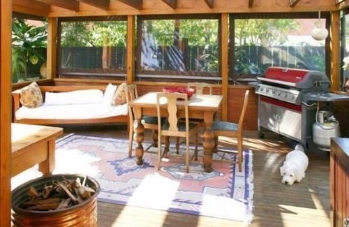 The master bedroom has French doors which open out to the gardens and the surrounding native trees providing a delightful backdrop to the distinctly appealing decor. The second bedroom has one entire wall of windows which makes this a very light and bright room. Each of the three bedrooms is furnished with style and supreme comfort in mind. The ensuite bathroom to the main bedroom is a special feature with its French doors and bi-fold windows which brings the garden into the bathroom and will transport you to an exotic spa as you soak in the luxurious bath.