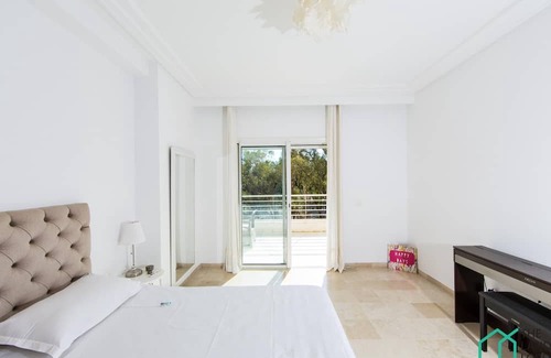 New apartment in one of the most popular residences of the Carthage Gardens: Rd Panorama. Very well oriented, and forest side, the apartment has a very nice terrace with an unobstructed and unoverlooked view. Composed of 3 bedrooms including a master suite, the apartment sleeps 6. It is fully equipped. It is a few minutes from Tunisia Mall, less than 10 minutes from Marsa and Carthage and 15 minutes from Tunis Airport. It has a parking space.