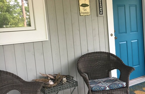 Comfort and seclusion are paramount in our fully equipped, air conditioned, 2 bedroom, 2 full bath condominium. The master bedroom has two full size beds and a private bath with double sinks, private dressing area, and private bathtub/shower and toilet room. The second bedroom has two full size beds, and shares a hall bathroom with a single sink, bathtub/shower combo. There is a private entrance to the bathroom directly from this bedroom. The living and dining combo space provides dining. The living room provides a queen sofabed. Free wifi access is provided. There is a large Smart flat screen TV in the living room and flat screen TVs in both bedrooms. Kitchen is fully equipped with microwave, dishwasher, four-burner electric range, and full sized refrigerator with ice maker. Small appliances include a coffee maker, toaster, blender, crock pot, iron, vacuum, and can opener. There is a full sized stacking washer and dryer located in a closet within the unit. The living room and porch have ceiling fans. There is a covered front porch with a relaxing area for two to sit. The rear covered porch contains a dining table set up for four.