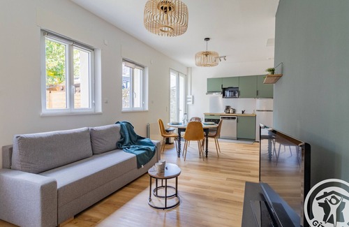 Inside, the colors are soft and pleasant. The main room of 24m² offers a small fully equipped kitchen, a dining area for 4 people and a living room with television. Small bedroom of 9 m² with 2 beds of 90x190cm and a bedroom of 12m² with a bed of 140x190cm. Both bedrooms have a clear view of the garden without any vis-à-vis. The beds are made on your arrival. Shower room and separate toilet.