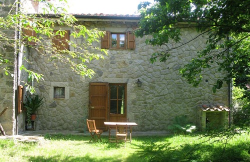 Podere dei Castagni is part of a beautifully restored old farmhouse nestled in the hills of the Val D’Orcia beneath the gentle slope of Monte Amiata (1738 m.). The house has a charming, country feeling, and is set in a quiet, wooded three acre property with many plantings and stonework. The interior of the house is clean and bright. The first floor is large and open, with a kitchen equipped for cooking including oven, refrigerator, microwave, toaster, American coffe maker all new . A living room with a large traditional Tuscan fireplace, and a bathroom with shower. It is filled with natural light and views of the surrounding gardens. On the second floor are two bedrooms and a bathroom with shower. The house is furnished with local antiques and original artwork. Architectural details include cotto tiles, wooden beams, local stone, and doors from a medieval bell tower. The house’s elevation and ventilation afford cool and comfortable nights during the hot Tuscan summer. Laundry/washer on site.