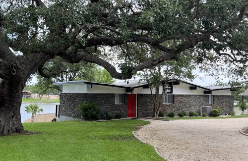 (Please, no pets :-) Enjoy the huge stunning view of the Llano River arm of Lake LBJ with floor to ceiling windows set in a renovated retro-modern 60’s lake cabin, with 1132 square feet of living space set on 150′ of lake front! Now with free Level 2, 48 amp, EV charging! It's located on the best part of Lake LBJ, a constant-level lake, and perfect for all types of watersports. House has a modern front-loading washer and dryer. Boat dock pier has 2 pairs of mooring whips that safely secure most any boat or PWC. Neighborhood boat ramp is two doors over, which provides easy access to launch and retrieve your watercraft. 3 adult-size kayaks, 1 child-size kayak, life jackets in all sizes, beach towels as well as a "LillyPad/Frogmat" are provided. Large sunscreen-covered back deck includes both a BBQ gas grill and a large Blackstone 36" gas griddle. The gigantic backyard has a large shady lakeside "Palapa" (tiki hut) with ceiling fans. Lots of parking in front of the house for cars and trailers. A watercraft rental company is about 1 minute away, along with an HEB grocery store 5 minutes away.