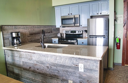 Our home is a renovated one bedroom condo in Rimfire Lodge which can accommodate four guests with one queen bed and one queen pull-out and is located right in the middle of Snowshoe Village. Our unit is literally a one of a kind in Rimfire Lodge that offers many unique features. To begin, the location of our home is on the first floor but has vaulted ceilings which gives an airy expansive feel. The most dramatic feature is a full wall of windows in the living room that faces west for a stunning sunset view that can be enjoyed from the living room or the private deck. All furniture has a warm feeling and is of high quality yet comfortable. Every year we make updates and replacements to the condo for the enjoyment of our guests.