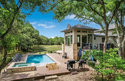 Private estate with ~1,500 feet of frontage on Little Blanco River (usually dry due to drought). Oversized windows look onto the ancient oak forest, with 20 acres of private hiking. Lavish pool & jacuzzi, large patio with fire pit and barbecue for outdoor dining under large tree canopy. 3 private bedrooms each with en-suite bathroom, plus bonus room (off the master room) with triple bunk for kids or adults. Additional pull out queen sofa bed and an extra bathroom. Quiet, exclusive and peaceful!