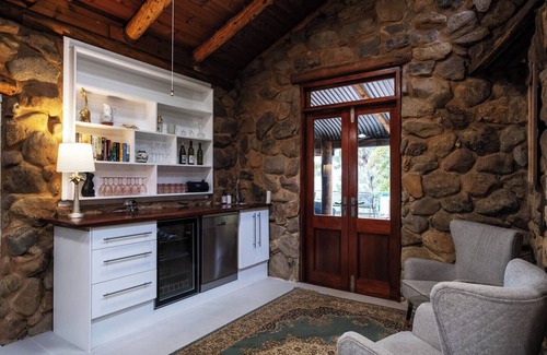 The adjacent Bear Cottage is a quaint, two-storey, fully self-contained unit, creating privacy from the main house and accommodating four guests. On the ground floor is a charming open plan living space with a kitchenette and small dining table. A sofa and fireplace encourage you to get cosy in the evenings. There is a well-presented bathroom with a shower, toilet and basin. Heading upstairs, the bedroom is furnished with a queen-sized bed along with a double, offering a great space for families. There is a lovely seating area or reading nook opening to the balcony and capturing impressive vistas over the land.