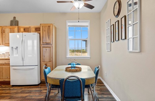 The Star-light Cabin is situated on a 48 Acre ranchette located about 18 miles east of Temple, Texas. This secluded, spacious 2 bedroom, 2 bathroom cabin which serves as the “guest house” for the property, is located about 200 yards from the main house, and comfortably sleeps 6. This property is a working ranch with a small number of registered longhorn cattle, which freely roam the property. The home itself is approximately 1200+ sf with both bedrooms fitted with their own bathrooms and walk-in closets. There is a nice kitchen, living space with a large, screened-in porch across the back. Situated atop the highest elevation of the ranch, the views are plentiful, with a beautiful lake and rolling terrain, featuring lovely grassland, dotted with trees. Located in sparsely populated Milam county, wildlife abounds…Deer, coyotes, bobcats, hawks, eagles and other critters frequent the area and are routinely spotted. Expect stunning nighttime star gazing and refreshing daytime panoramic views. Get away from the grind, put your mobile phone away, build yourself a campfire in the fire pit, and roast yourself some marshmallows or smores, while you enjoy fresh air and the peace and tranquility of country living. But don’t worry, you wont be “off grid” or anything like that. AT&T internet is provided, and there are 3 smart TV sets (Living and in both bedrooms). Plus, you are just a short ride away from the Temple and Belton areas where there is plenty to do and see, coupled with many, delicious dining opportunities. Multi-zone a/c and heating means you can set your room to fit your temperature needs. Sit in the spacious screened-in porch, while sipping on your coffee, and during cooler weather, you might start a fire in the wood burning stove to add warmth and create a cozy evening indoors. Whatever you do, you will enjoy this unforgettable and wonderful get-away experience, and you will be pleasantly surprised with both the quality and the privacy of this unique space.