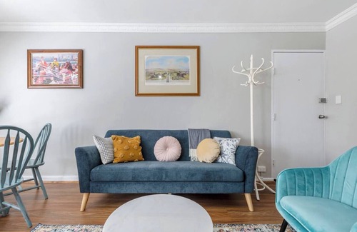 Step into this warm and inviting apartment, ideally situated in the heart of Windsor, but tucked away on a leafy, quiet side street. The cosy living area beckons you to unwind, complete with a TV, lounge and armchair. The galley kitchen is adorned in black and white tiles, sage cabinetry and premium appliances so you can test your gourmet cooking skills or whip up something quick to eat before heading out for the day. A four-seater dining table in the living area caters to meals at home or family game nights.
