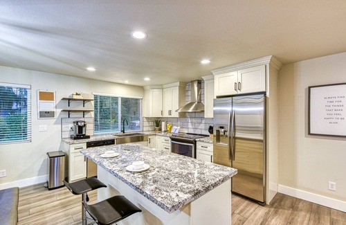 Stunning New Mid Century, Modern theme w/ a farmhouse twist! This spacious, luxurious home is 3140 sq ft. 6 large bedrooms / 3 bath w/ a 2nd kitchen downstairs. Open Concept and wonderful for groups! Disney+, HBO, and Netflix available for family nights! Portable AC units.