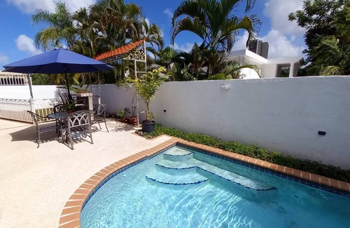 •Villa Mifany guest suite w/private pool 24/7, separate from the main house, independent entry, self check-in with lockbox, A/C, Wifi, TV, full bed, hot water, refrigerator, microwave, outdoor kitchen/ stove/sink/ BBQ, rice maker/coffee maker & toaster. Terrace w/living & dining area. Patio set table, chairs and umbrella, gardens, fish pond and parking, in a quiet gated community. Max 2 guests. Smoking area, daily maintenance of outdoor areas