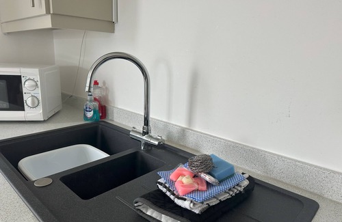 With an open plan kitchen-living area and a number of large windows, the space feels light and airy with ample space. The breakfast bar, dining space and plush sofas make this apartment great for entertaining. Whilst this space is perfect for socialising, the monochrome decor gives the room a timeless look; perfect for enjoying your favourite streaming services on the smart TV. The kitchen is well equipped with utensils, crockery, a kettle, toaster, microwave and basic pantry items such as oil, salt and pepper. Additional kitchen amenities include an oven, induction hob, refrigerator, freezer, washer-dryer and dishwasher.