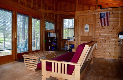 This 16' x 24' cabin sits on eleven acres of ocean frontage at 105 feet above sea level (one of the highest points on Islesboro), providing beautiful westerly views of Penobscot Bay, Northport and Belfast, including some of the most colorful sunsets witnessed by the human eye. The cabin contains a kitchenette, with a four-burner electric stove and oven, as well as an under counter refrigerator. There is a 3/4 bath which services two adults easily as well as a queen sized futon to sleep two inside the cabin. Another couple could set up a tent and camp if a group of four were interested in traveling/vacationing together. While there is no landline phone, there is good cell service for the more popular carriers as well as 1 GB of internet service with wifi.
