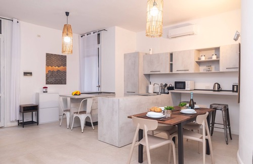 The apartment has a terrace with sea views so that guests can enjoy the glorious Sardinian climate at any time of year. Guests can access the open-plan living area, via a glass door which leads directly off the terrace. The stylish inside space includes a modern fitted kitchen which is equipped with an induction hob, oven, microwave, fridge/freezer and Nespresso machine. The kitchen also has a smart dining table and a separate breakfast bar.