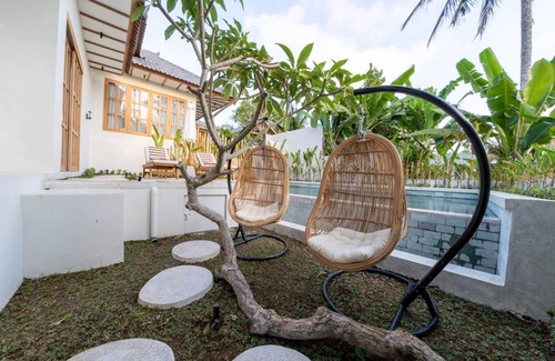 Welcome to Semiramida by EVDEkimi, a beautiful villa located in the heart of Bali, Ubud. This single-story villa has a lovely courtyard with a lush garden, a sparkling pool, and comfortable sun loungers with parasols. Rest in the wicker chairs with soft cushions near the pool and enjoy the serene environment. The villa's patio also has an outdoor shower and an open-air bath for complete relaxation. You can relax here by reading a book, enjoying a glass of wine in the outdoor tub while listening to sounds of nature, or admiring a private pool.