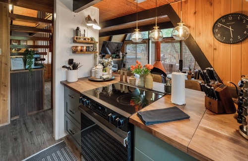 The cabin blends cozy A-frame charm with modern style — warm wood accents, clean lines, and floor-to-ceiling windows that flood the space with natural light and forest views.
