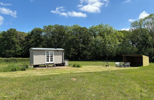 Shepherd Hut 1 is a single-storey property with a studio-style layout featuring a double bunk (double above, double below), kitchen, and dining area. The shower room includes a gas-powered walk-in shower, basin, and compost WC. The kitchen is equipped with a gas hob, fridge, and kettle. The hut also has a TV and board games. Bed linen, towels, fuel, power, and a starter pack for the woodburning stove are included in the rent, with additional wood available on-site for 5GBP per bucket. Free off-road parking is available, and there is an outdoor seating area with a fire pit/barbecue, picnic table, benches, and field shelter. One well-behaved dog is welcome, but smoking is not allowed. Please note that there are no 3-pin sockets within the huts, but two solar-powered USB points are available. There is no WiFi at the property. Although the hut is single-storey, there are steps up into it, and parking is a short walk from the hut as cars are not permitted on the field. Enjoy your stay at Shepherd Hut 1!