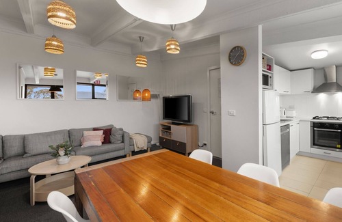 This modern and bright apartment offers guests a spacious lounging area, TV, Dining area next to the galley kitchen which is well appointed and amazing views across the High Country.
