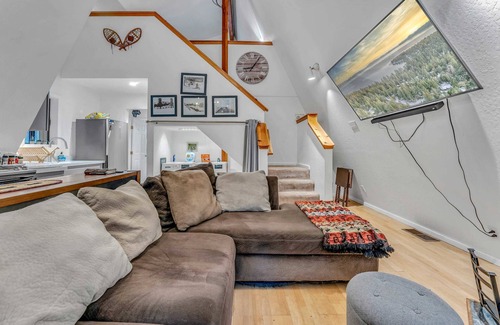 Step into this A-frame home, where vaulted ceilings and natural wood accents create a welcoming mountain retreat. The open-concept living area features a wood-burning fireplace and a sectional sofa, offering the perfect spot to unwind after a day of adventure. The fully equipped kitchen includes everything you need for meal preparation, such as a drip coffee maker, microwave, and essential cooking utensils. A kitchen island with barstool seating for 2 provides a convenient space for casual meals or quick snacks.