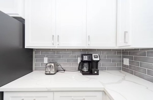 The kitchen has all brand new stainless steel appliances and is stocked with pots, pans, dishes, silverware, blender, crock pot, Keurig, and regular coffee pot as well as other items for our guests' use.