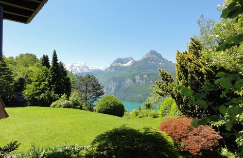 The apartment is located in a newly renovated holiday home in chalet style and offers an incomparable view of the lake and mountains. The house is located on a rock terrace above Lake Lucerne in a large well-tended garden and in the immediate vicinity of the leisure, bathing and wellness center 'Swiss Holiday Park' and the historic sites of pristine Switzerland. Suitable for 4 - 6 people. Another bedroom (2 beds) with toilet / shower can be rented.