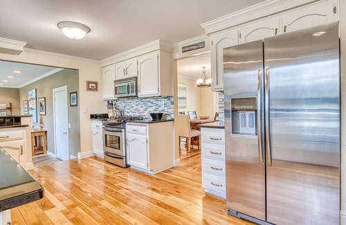With a prime locale in southern Bend, this stunner offers golf-course views and is the perfect home base for your Pacific Northwest getaway. The spacious ground floor presents two living areas -- both with flat-screen TVs and picture windows. Use the quaint home office, fitted with a desk and a printer. An upgraded kitchen is equipped with a full suite of stainless steel appliances.