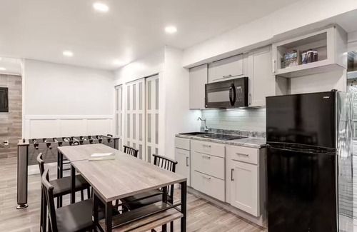 The kitchen includes modern appliances, a Keurig coffee maker, and all essentials. The dining table seats 8 comfortably for family meals or game nights.