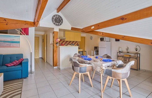 This spacious, attic T2 cabin of over 45 m² is located on the second floor of the Ormes residence and offers a clear view of nature with its south-facing [hidden] large living room includes an open kitchen equipped with 4 cooking plates, a refrigerator-freezer, a microwave, a mini-oven, and a washing machine, a lounge area with a sofa and television, a dining table with 4 chairs, and a sideboard. The living area is illuminated by a French door opening onto a south-facing balcony, featuring garden furniture. Its attic bedroom has a 140 cm bed (small dressing area), a second cabin bedroom with a 90 cm bed and a storage closet. Its bathroom features a shower cabin and a vanity unit along with the washing machine. The toilets are separate. Electric heating.Free parking and WiFi. Air conditioning.Additional services for a fee: linen rental.
