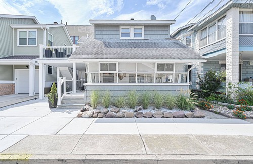 Charming 2-bedroom beach retreat occupying the entire first floor with a private entrance just two blocks from the beach & boardwalk. Bright sunroom with futon and porch access. Living room features a smart TV, sectional (queen pull-out), and dining table for four. Kitchen includes a high-top table for two. Main bedroom has a queen bed, second bedroom has a full-over-twin bunk. Jack-and-Jill bathroom with shower/tub combo. Enjoy the front porch, back patio, and provided beach tags/chairs.