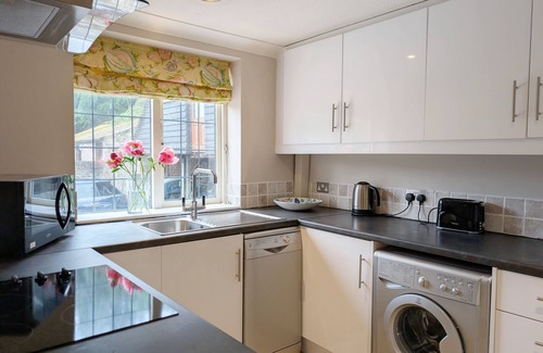 The open-plan living area is bright and tastefully furnished, with a comfortable seating area and a small desk that offers a quiet spot for working from home. Whether you're catching up on emails or simply enjoying a book in a peaceful setting, it's a convenient and calming space. The adjoining kitchen is fully equipped with modern appliances, including a dishwasher, washing machine, oven, microwave, kettle, fridge, and freezer—everything you need for a stress-free self-catered stay.