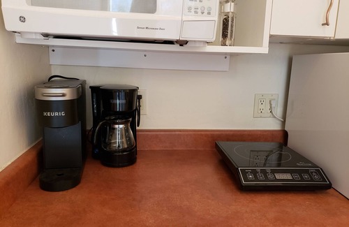 The fully stocked sunken galley kitchen is equipped with an induction cooktop, microwave, toaster oven, Mr. Coffee, Keurig, electric kettle, and a selection of coffee pods, teas, and condiments; everything you need for effortless meal prep.