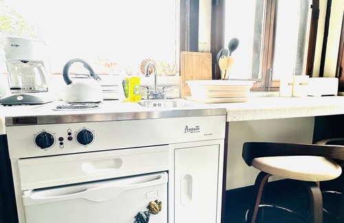 Small kitchenette holding mini-sized fridge, electrical stove with two hobs, microwave, toaster, drip-coffee maker, pots and pans, dinnerware, water glasses, wine glasses and mugs. Bathroom with hot/cold shower and tap, hooks and rails for clothes, hair dryer;