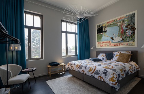 The harbour master was held in high esteem and it shows in this residence. It is an imposing three-storey building with a spacious garden. The owners, creative agency PK projects, work on the ground floor. The holiday flat has a private entrance and occupies the two upper floors, some 200m2 in size. On the first floor you will find a fully equipped kitchen, a spacious dining area and a cosy lounge with 65inch flat screen. In addition, this level also has a large bedroom, a bathroom and a toilet. On the second floor there are three more bedrooms, one of which has a mezzanine with an extra single bed. Also on this level there is a bathroom and even two toilets. Nice weather? Relax in the spacious garden of around 500m2. There are two sun terraces, a playground and the swimming pond provides cooling. The barbeque and spacious dining table complete the picture. All this makes 'Havenhuis Brugge' the ideal holiday home for friends or families up to 9 people.