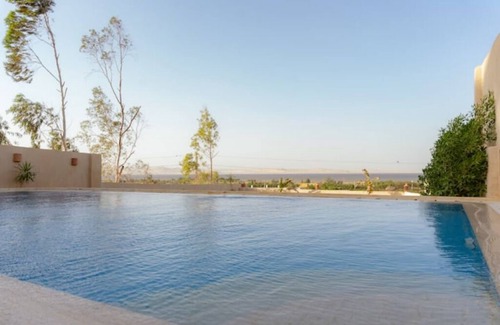 Sunset chalet is a secluded haven in Tunis village , it's prime location offers a breathtaking panoramic views over Qaroun lake , the edge of Qatrani desert and the green fields beneath .