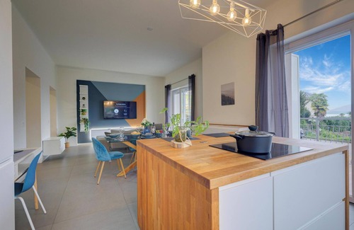 Inside, the open kitchen-diner is fully equipped with an induction hob, oven, and dishwasher, ideal for preparing meals. The bright living room features a terrace where you can enjoy the beautiful lake view. Modern amenities include free Wi-Fi and a Smart TV.
