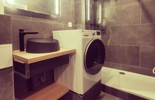 The bathroom has a walk-in shower, WC, washing machine and towel dryer.