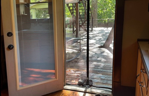 This is the smallest of 4 apartments in a beautifully restored, turn of the century home that was turned into apartments in the 1920s. Three huge sycamore trees surround the house. The fully fenced back yard is a nature retreat complete with pond and sometimes frogs. Large decks surround the back of the house with each tenant having their own share of deck and a BBQ. Everything has been thought of to make your stay as easy as being home but also special and different. Owner :)nga 1 block away from the town natural food store7 blocks from the town square, a pleasant quiet neighborhood. Easy peasey.... Half way between the town square and the university. One block down a country lane feeling alley to the grocery store. Easiest location. Free bikes for getting around or enjoying the 17 mile bike loop around Fairfield.