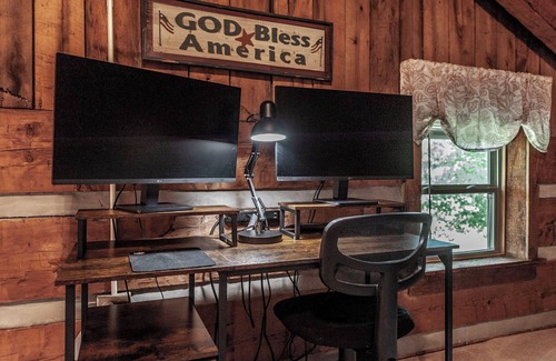 We have furnished the cabin with your comfort in mind. You will find a large open living area with a stone gas fireplace for chilly cozy evenings. There is a full kitchen with everything you'll need for home-cooked meals complete with a full size refrigerator and dishwasher. The main floor master bedroom features a queen size bed and private bath with jacuzzi tub. Upstairs there is a bedroom with two twin beds plus, a loft with another twin bed, and a rollaway bed available upon request. The loft also has a desk for guest use with twin monitors and a 2nd full bath with a stand up shower. A washer & dryer are also provided for your convenience. Outside you can relax on one of two porches watching the cows graze.