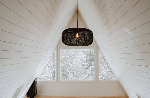 There are two dedicated bedrooms and a finished basement with a queen-size Murphy bed. The main floor bedroom features a queen bed and beautiful views of the forest. The tranquil master bedroom upstairs includes a king bed and custom barn doors that frame a view through the A-frame, along with windows facing south and west toward the trees and mountains.