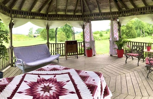 Has curtains on all sides and a bug net surrounding each bed so bugs are never an issue. Private outhouse for this site that is cleaned before each guest and emptied regularly. Has a private fire pit and table outside as well as a BBQ for your use! Lots of open space, trails and property to explore. Cowbell brewery is close and lots of towns and restaurants for a getaway!