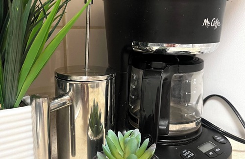 The kitchen offers all cooking essentials, great for prepping up meals. Comes with a toaster, a toaster oven, a full size oven and stove, a microwave, coffee maker, and a full size refrigerator. Basic cleaning supplies are also provided. Super cute and simple everything you need :).