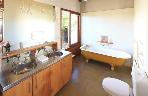 The master suite is ideally located at the end of the house, well positioned for privacy and taking in the beautiful views of the sea. This bedroom is adjoined by an ensuite bathroom with claw foot bath and open shower. Bedrooms 2 and 3 are located at the other end of the house and also take in the glorious views. Bedroom 4 is furnished with a set of bunk beds and overlooks the garden. The main bathroom is conveniently located amid the bedrooms and offers a double shower.