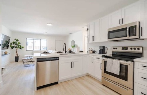 Welcome to the Pass-Through, a completely remodeled 2 bedroom | 1 bath villa. An entertainer's kitchen for you and your family to gather and wind down from your travels, fully equipped with all kitchen necessities. A welcoming yard where you can relax after a day full of activities. Our cozy living room has a sectional that fits 5 guests comfortably and a 65" Smart TV. The villa is also equipped with cleaning supplies and tools, as well as a washer and dryer for you to freely use during your stay.