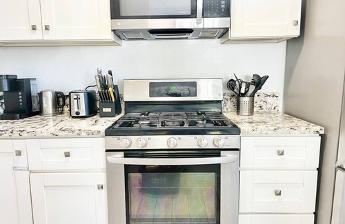 Our spacious and fully furnished apartment is designed to meet all your needs during your stay. Relax in a comfortable queen-size bed with fresh linens, enjoy your morning coffee from our provided Keurig coffee maker, and stay connected with our high-speed Wi-Fi. Take advantage of our fully equipped kitchen to cook up a delicious meal. We provide essentials such as towels, shampoo, and soap, as well as an iron and hair dryer to ensure you look your best.