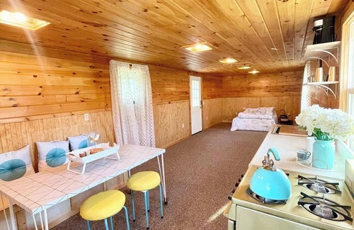 This cozy wood-paneled cabin offers a simple, peaceful retreat surrounded by nature. It is off-grid except for electricity — there is no running water or sewer. An outhouse is available for restroom needs, and an outdoor tent shower is set up in warmer months. A fire pit for cozy night under the stars. Inside, you’ll find a comfortable bed, small kitchen with basic cooking supplies, and a seating/dining area. Perfect for guests who appreciate rustic charm and a back-to-basics experience.