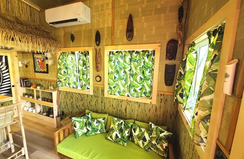The Tiki house has a bar kitchenette, electric heat, air-conditioning, a flush toilet, and a hot shower plus luxury linens. We hope you have as much fun staying in the Tiki as we had creating it.