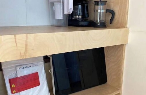 The kitchenette has the basics and then some... a portable induction cook top, pots and pans, cooking utensils, basic spices and condiments. It also has a Britta water pitcher/ filter for your convenience!
