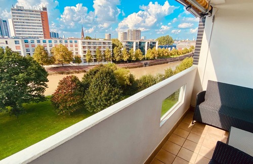 Our holiday apartment DÜNENLOFT offers its guests a great, maritime atmosphere in the noble beach house design. Located in the 6th Floor (from 7) enjoy a fantastic panoramic view of the idyllic Geeste (right in front of the house) with the rowing boats and sports boats, on the Weser with the passing sea-going vessels as well as on the Bremerhaven city center.