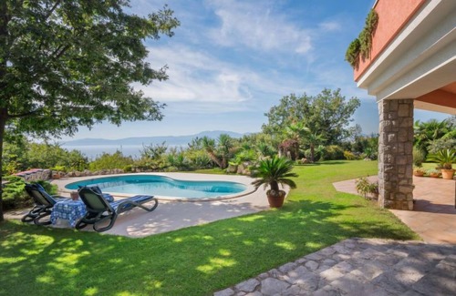 Beautiful villa "Anamia", 3 storeys. In the district of Kostrena 5 km from the centre of Rijeka, 25 km from the centre of Crikvenica, in a quiet, sunny, elevated position, 400 m from the sea, 400 m from the beach, in a cul-de-sac, in the countryside. Private: property 890 m2 (fenced), lawn 300 m2, swimming pool (24 m2, depth 140 cm, seasonal availability: 01.Jun. - 15.Sep.) with internal staircase. Unconventional pool shape. Outdoor shower, terrace (40 m2), garden furniture, barbecue. In the house: internet access, air conditioning, washing machine. Shop 1.3 km, supermarket 2 km, restaurant 400 m, bus stop 450 m, pebble beach 650 m, rocky beach, concrete beach 400 m. Groups of teenagers on request only. By groups of young people double deposit is requested on arrival. Swimming pool with counterflow and hydromassage. Well behaved pets are welcomed.