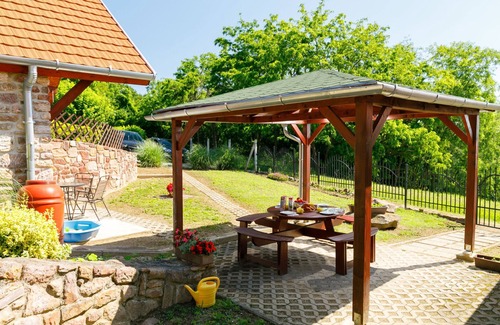 Ábrahámhegy 30 km from Keszthely: House "Fokas", detached, surrounded by trees, meadows and vineyards. 1.6 km from the centre of Abrahamhegy, on the outskirts, 15 km from the centre of Tapolca, 33 km from the centre of Keszthely, in a sunny position on a slope, 2 km from the lake, 2 km from the beach. Private: property 300 m2 (fenced) with trees, meadow. Children's playground (slide, swing). 1 km long bumpy, narrow motor access (200 m via unmade road). Parking (for 2 cars) on the premises. Grocery 1.6 km, supermarket 13 km, restaurant 1.6 km, bicycle rental 8 km, grass beach 2 km, thermal baths "Hévíz" 39 km. Tennis 2.5 km, cycle lane 800 m, children's playground 1 km. Nearby attractions: Festetics Castle 34 km, Tihany 33 km, Balatonfüred Annagora Aquapark 33 km, Tapolca Lake Cave Visitor Centre 14 km, Szigliget Castle 16 km, Festetics Zoo 32 km.