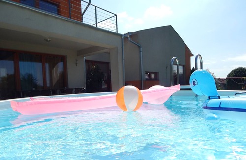 Our new villa with panoramic view over Lake Balaton can be rented for 8-10 + 2 people in the summer. The house has an own private pool and paddling pool for children inside the house along with Jacuzzi and a small room filled with fitness equipment. In our closed garden you can find sunbathing terrace, playground with swing and slide, parking spots, sun beds, garden furniture, BBQ and a garage for 2 children. Our wellness facilities include a 7 × 3 m long pool, a paddling pool for children, and Jacuzzi, sauna for 8 people and fitness equipment inside the house. So no matter what the weather is like you can use all of them. The house itself contains two storeys with air-conditioning and is equipped with an alarm system as well. Altogether there are 4 bedrooms all with double beds, 2 bathrooms with showers, 3 toilets, one big living room with TV set, a kitchen with dining area and the wellness area.